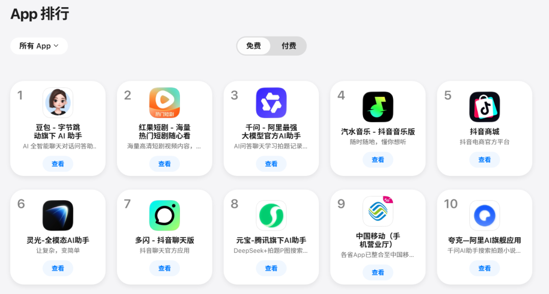 据观察,11月25日,苹果的应用商店App Store免费总榜单前十名中,有一半都是AI助手。其中,豆包(字节跳动旗下)排名第一,千问(阿里巴巴旗下)排名第三,灵光(蚂蚁集团旗下)排名第六,元宝(腾讯旗下)排名第八,夸克(阿里巴巴旗下)排名第十。